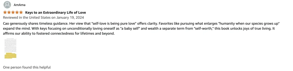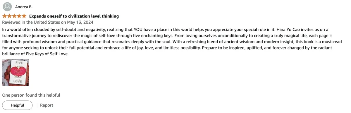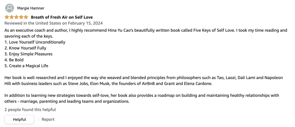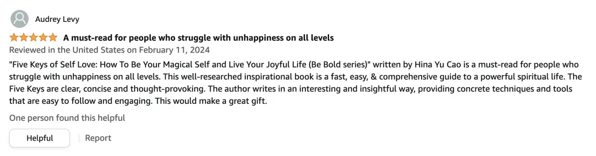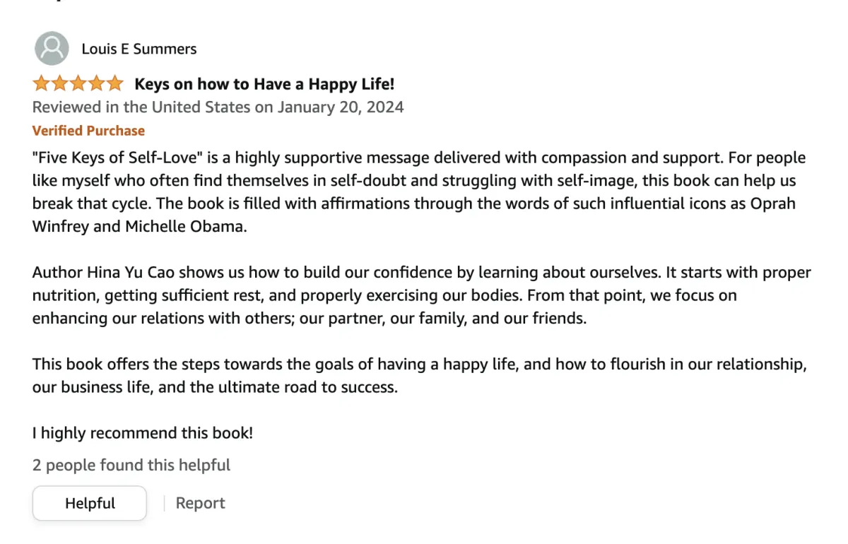 "She writes from the heart. [Five Keys Of Self Love] is about what everyone needs more of and to spread more love would make this world a better place for sure."